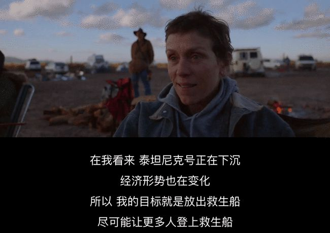 故事呈現著個體的經歷和情感,但不止于情感,這也是《無依之地》能在更深層掃描社會元素的力量。導演對弗恩乃至整個游牧民群體的刻畫帶著強烈的被遺棄感,遺棄來源于正常——弗恩并不特殊,不是癮君子也沒犯過罪,她和每個普通人一樣勤勤懇懇,愛和被愛,擁有過一切尋常光陰。而這樣一個人,隨時可能被生活徹底拋下。“后傷心時代”的人們回憶著金融危機時的恐懼、家園的蕭條,而流浪正是他們對現代秩序的不信任與徹底放棄。從一個人的傷,到底層社會的群殤,不斷加深的陰影與試圖向外出走的蒼茫,是創作者對美國社會內在被深層破壞后的觀察。