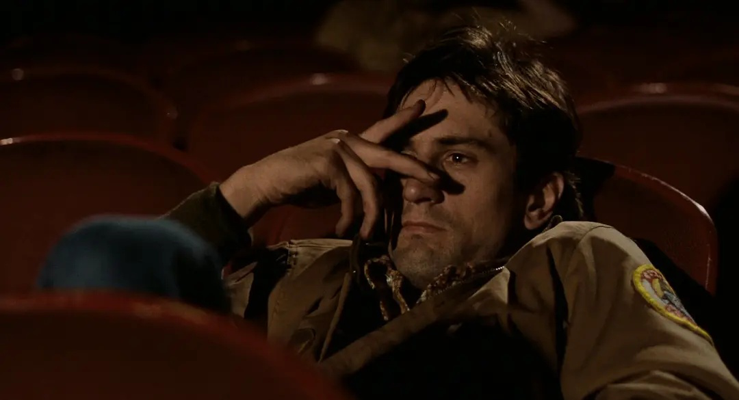 導(dǎo)演巧妙地運(yùn)用了景框,表達(dá)了六七十年代,美國年輕一代內(nèi)心距離的疏遠(yuǎn)感,還有游離在社會外的無力感,難怪崔維斯一直給觀眾寂寞如影隨形的感覺。崔維斯與貝西第一次吃飯的構(gòu)圖也值得推敲,兩人沿菱形桌子的兩邊兒坐正好平分畫面,正中間窗戶的窗框?qū)扇烁糸_,暗示二人最終無法走到一起,影片中還有大量空鏡頭拍出了燈紅酒綠的紐約夜景,社會上到處充斥著黑幫、吸毒者、妓女,人們?nèi)缤惺呷猓攀幎诸j廢地生活著。導(dǎo)演對社會環(huán)境的描寫足夠真實(shí),因此人們的精神廢墟也足夠令人震撼。