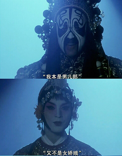 程蝶衣認(rèn)為戲即人生,所以他并非演虞姬,他就是虞姬,虞姬對(duì)霸王情深意切,他對(duì)段小樓也是付出真心,段小樓說他“不瘋魔,不成活”,正是因?yàn)樗蔀榱擞菁В庞辛私^代的風(fēng)華。也正因如此,他始終活在戲中,與外界脫軌,才與現(xiàn)實(shí)的世界格格不入。他的世界里仿佛只有京戲,他按照自己的準(zhǔn)則生活,所以在法庭上,他可以說出“可是他們沒有打我”,他可以擲地有聲的喊“青木要是活著,京戲就傳到日本去了。”他這種不將就、不妥協(xié)的性格,也是造成“虞姬怎么演,都是一死”悲劇。