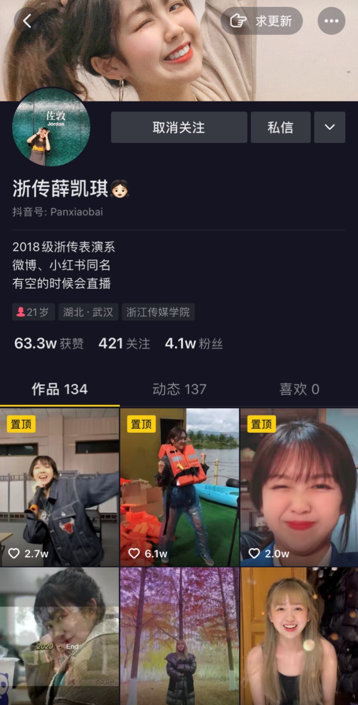 “就是走在路上的時候會有人指著我說,哦,這個是抖音上那個‘浙傳薛凱琪’,對我的生活來說并沒有形成什么很大的影響。”潘宇婕在談及抖音是否影響自己的私人生活時不禁開懷。