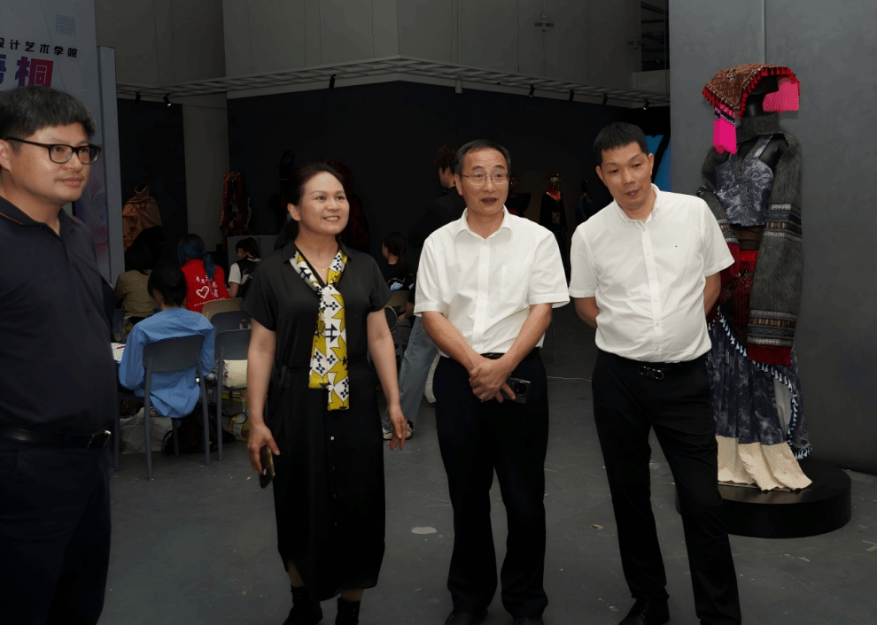 在戲劇影視美術設計專業負責人危怡教授的導覽講解下,韋國潭等一行參觀了各主題展區,實地觀摩學生創作成果。在“戲劇影視造型設計”展區,大家饒有興致地駐足觀摩,通過與創作者的深入交流,詳細了解了作品的創作主題和展示的民族文化特色。在“服裝與服飾設計”展區,設計藝術學院與英國考文垂大學聯合培養的服裝與服飾設計專業畢業生設計作品充分展示了時尚與創意。在“戲劇影視場景設計”展區,制作精致、造型逼真的微型場景模型讓觀看者贊不絕口。