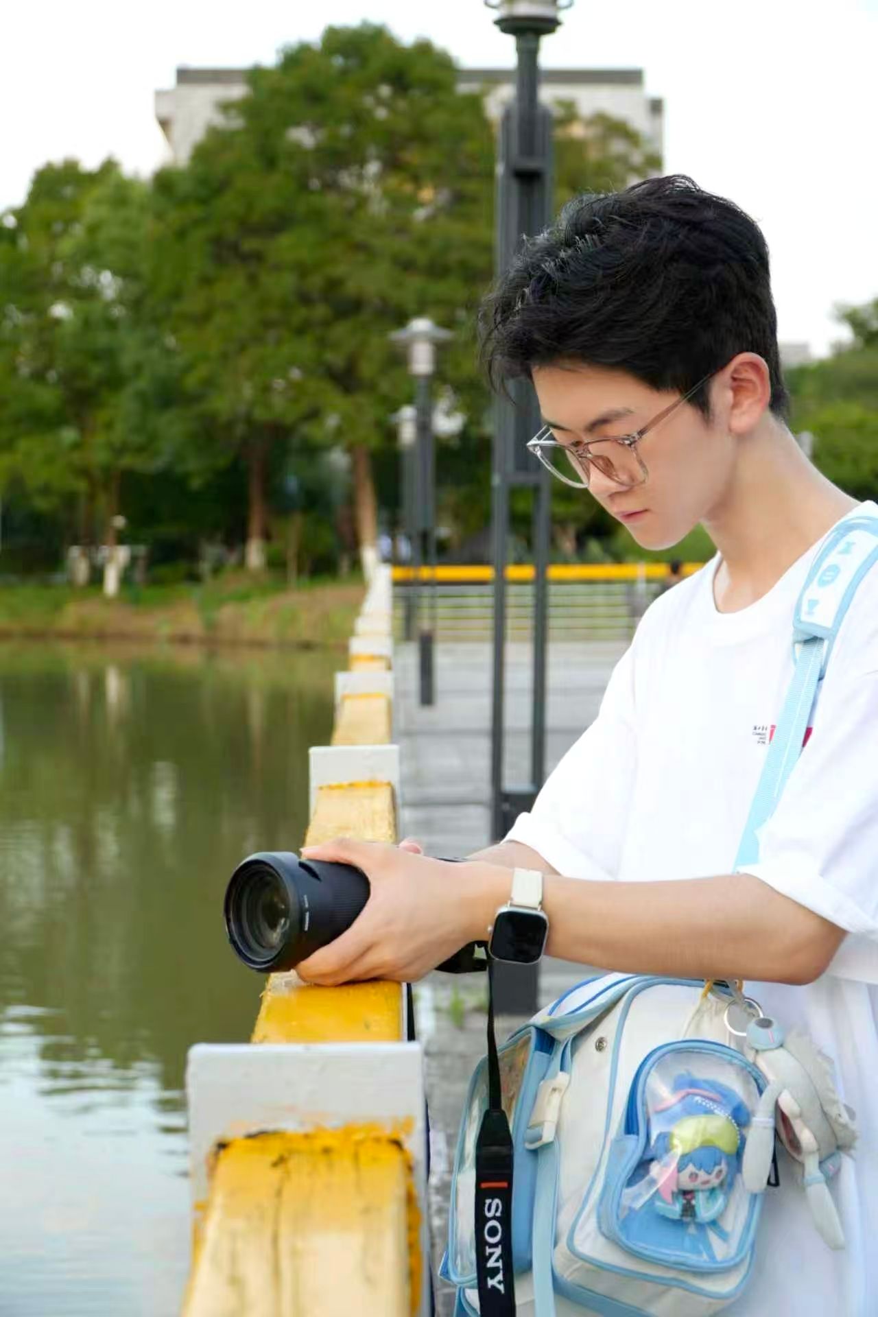 當廣播電視編導專業的郭皓然向我展示他鏡頭下我的照片時,我看到的不僅僅是我在像素點的拼湊下呈現的我的妝容長相,還有他作為攝影愛好者的角度創意與構圖巧思。通過相機,他捕捉到動態中的靜止的一瞬間,手中黑色攝影器械的取景框內定格著彩色的世界,他干凈簡單的打扮下蘊藏的豐富情思和活躍靈感,私底下,他喜歡二次元文化,喜歡社交與分享,用輕松的語調鼓勵他鏡頭下的每一個模特,也用開朗的個性感染著和他認識的每一個朋友。他的照片傳達出模特和攝影師共同呈現的情緒,記錄著瞬息變化的現實生活中一刻滯留的美好。