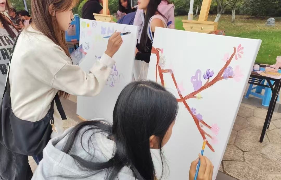 “百團大戰”的招新現場人潮涌動,處處洋溢著青春的熱情。一側展位前,幾位學姐開朗的聲音吸引了不少新生的注意。她們手中握著細長的畫筆,身后是一副巨大的水彩畫——畫上的小花在樹的枝丫上隨性自由地綻放,低飽和的用色讓整幅畫面顯得浪漫而舒展。經學姐們熱情介紹,這是一個宣揚藝術療愈的社團,旨在通過各類創意活動降低公共藝術的門檻,以藝術的力量療愈心靈。