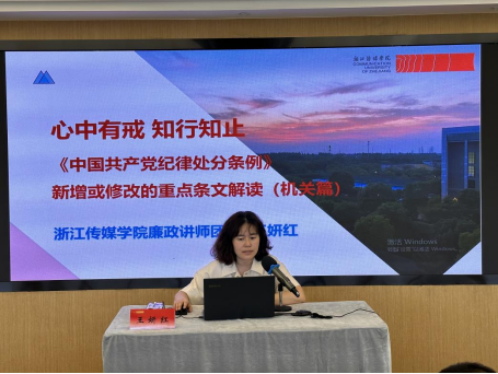 浙江傳媒學(xué)院廉政講師團(tuán)成員王妍紅博士應(yīng)邀講授主題為“心中有戒 知行知止”的專題講座。她詳細(xì)解讀了《中國(guó)共產(chǎn)黨紀(jì)律處分條例》新增或修改的重點(diǎn)條文,篩選高校典型廉潔風(fēng)險(xiǎn)和負(fù)面清單,用案件說話,讓警示入心。講座中還強(qiáng)調(diào)高校教師應(yīng)提高政治站位,貫徹立德樹人根本任務(wù),筑牢廉政理念和廉潔意識(shí),堅(jiān)持維護(hù)風(fēng)清氣正的“清廉浙傳”。