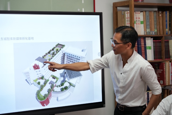 陳奇淼向楊立平一行介紹了東城智庫文化創意園基本情況。文創園集合了創業創新、時尚設計、新媒體、藝術創作、時尚餐飲等產業,是紹興市越城區首個文創園。目前全面改造升級,將在此建設紹興最大的短視頻直播基地,把園區整體打造成一個承載創意、創作、創造的城市新空間。