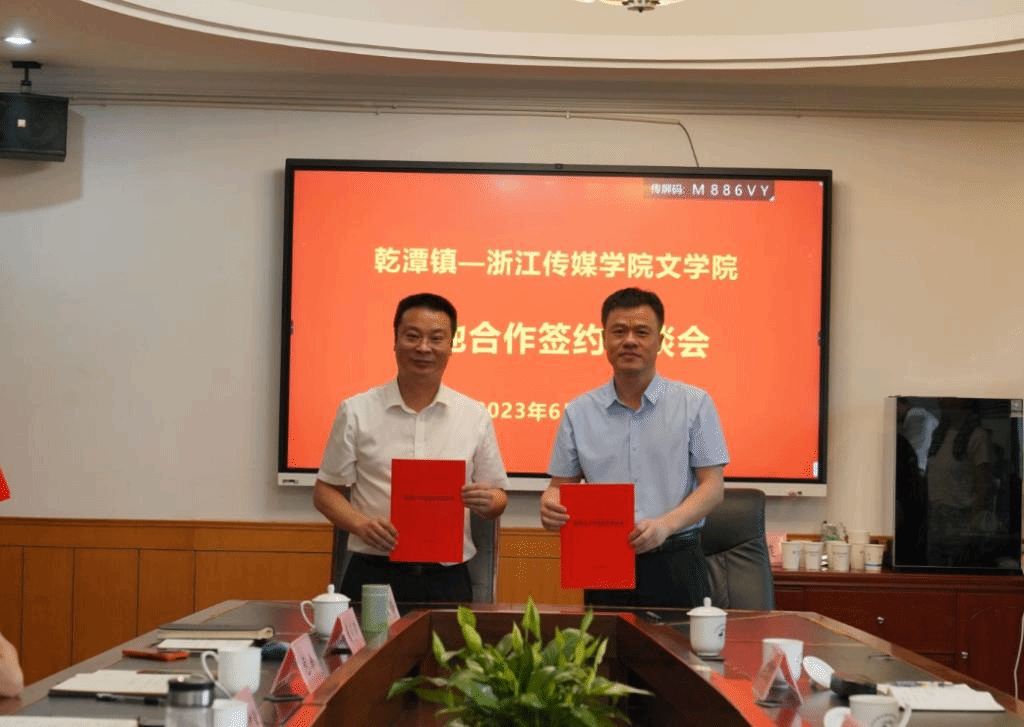 乾潭鎮黨委副書記、鎮長朱言與浙江傳媒學院文學院黨委副書記、院長朱文斌共同簽署黨建共建、校地人才交流合作協議。