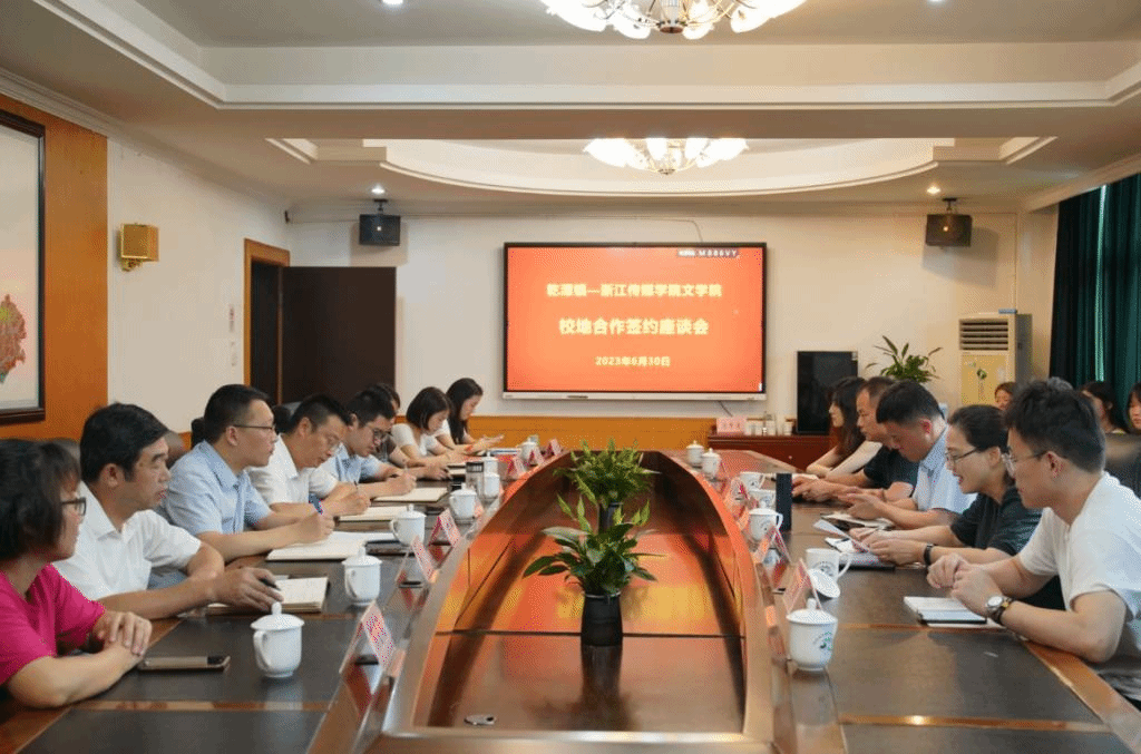 為深入開展學習貫徹習近平新時代中國特色社會主義思想主題教育,發揮高校服務地方的積極性和主動性,6月30日,建德市乾潭鎮與浙江傳媒學院文學院簽署黨建共建、校地人才交流合作協議。乾潭鎮黨委副書記、鎮長朱言,黨委副書記鄭雷駿,黨委委員方宇,副鎮長包韓,下梓村支書陳天飛,文學院院長朱文斌、黨委書記陳斌、黨委副書記朱強、學生工作主管樓翔、教師岳寒飛,以及社會實踐團隊學生參加簽約儀式。
