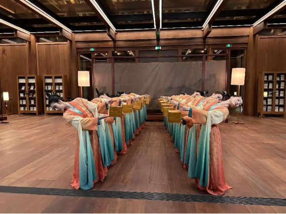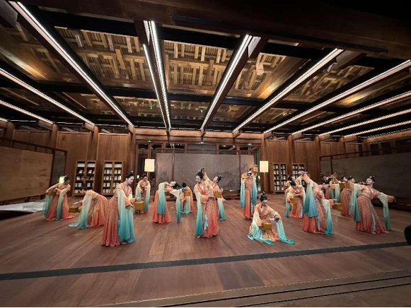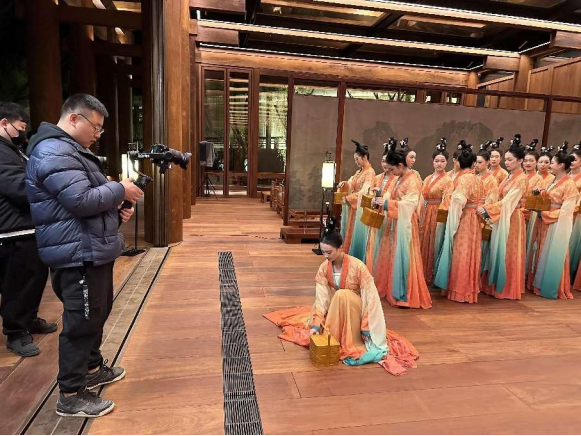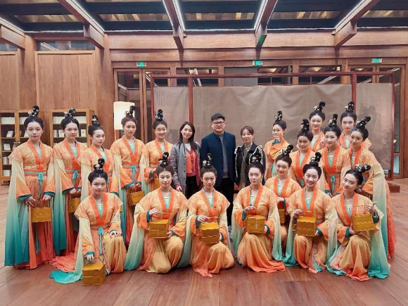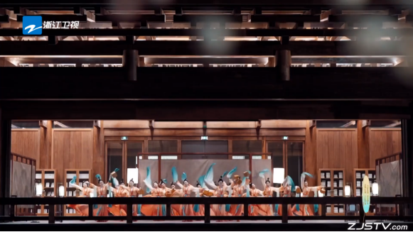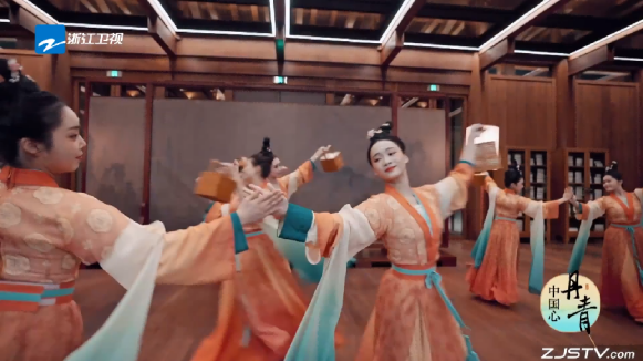 4月23日,音樂學院18名舞蹈編導專業學生參與浙江廣電集團Z視介“中國心”系列之《丹青中國心》錄制,傾情演繹了開場舞蹈《華燈夜宴》,將南宋經典畫作《華燈侍宴圖》通過舞蹈的形式生動展現在電視熒幕前。為滿足藝術效果,同學們用了近一年的時間反復打磨作品,將藝術與理論、古風與新韻有機結合,運用現代審美的加工,深化宋韻文化的創造性轉化、舞蹈意象的詩性表達,賦予了美術作品新的生命力,舞蹈嵌入中國建筑“沉浸式”的呈現樣式,以古今對話的形式使觀眾身臨其境地走進宋代,演繹出宋畫獨特的輕柔淡雅之風,無限高雅之美,展現了傳統文化的新生力量。