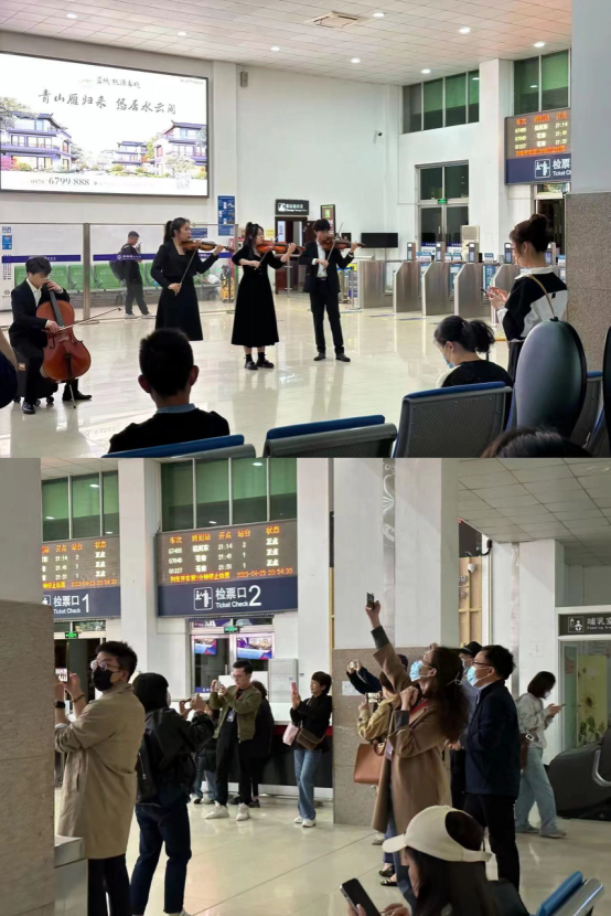 4月25日晚,在青田高鐵站候車大廳里,一場別樣的“音樂會”在這里上演,《愛的致意》《卡農》《梁祝》三首經典曲目,通過音樂學院師生手中的小提琴發出悠揚旋律久久回蕩在大廳里。雖然候車的旅客不多,但耳目一新地快閃演奏卻深深吸引了大家,很多人拿出手機記錄下這美好的瞬間。