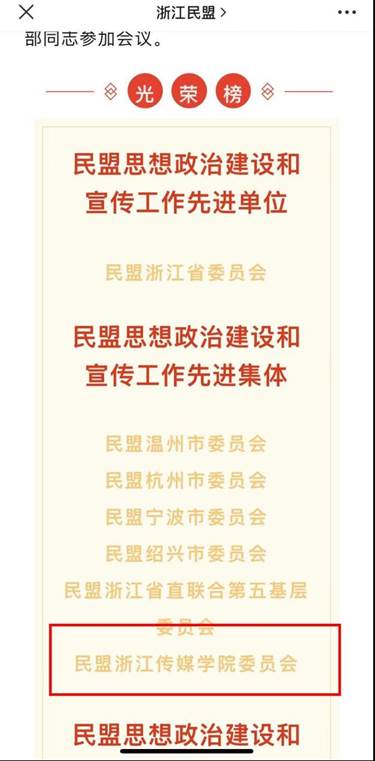 開幕會對2022年度民盟思想政治建設和宣傳工作先進集體和先進個人予以表彰。民盟浙江省委會被授予“民盟思想政治建設和宣傳工作先進單位”榮譽稱號。我校民盟委員會被授予“民盟思想政治建設和宣傳工作先進集體”榮譽稱號,浙江只有6個市級組織、基層組織獲此殊榮。