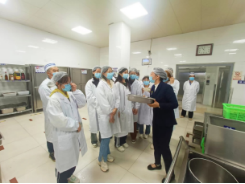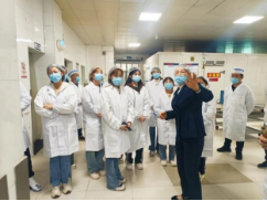 座談會前,在兩校區食堂負責人的帶領下,錢塘校區12名學生代表、桐鄉校區12名學生代表換上白色工作裝,戴上工作帽和口罩, 進入食堂后廚操作間參觀,餐廳經理就餐廳日常運營管理等內容進行詳細講解,并帶領大家先后參觀了洗碗消毒間、雞蛋房、面點房、洗切間、烹飪間等。同學們一邊參觀,一邊認真傾聽,并積極提問,在了解到食堂工作內容的同時,也理解了一線工作人員的不容易。