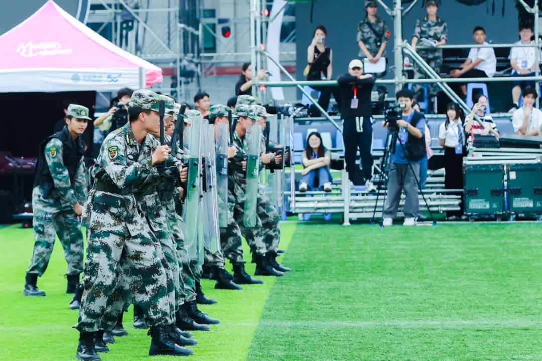 在團體表演環節,音樂學院帶來快閃表演《軍訓之歌》;一營同學帶來格斗基礎和海軍旗語表演;二營教員帶來戰術表演《戰狼》。