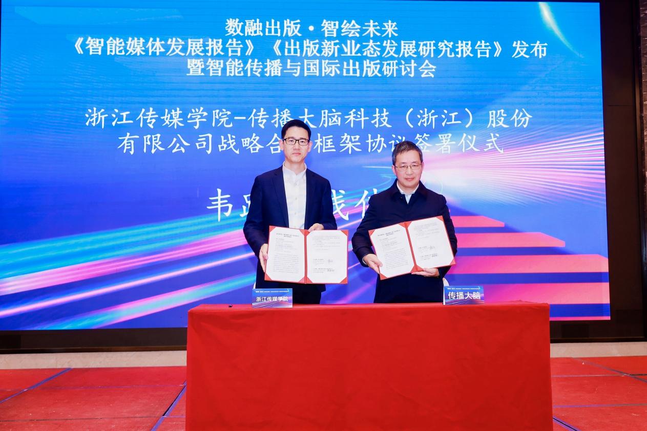 韋路、錢偉剛分別代表浙江傳媒學院與傳播大腦科技(浙江)股份有限公司共同簽署了雙方戰略合作框架協議。