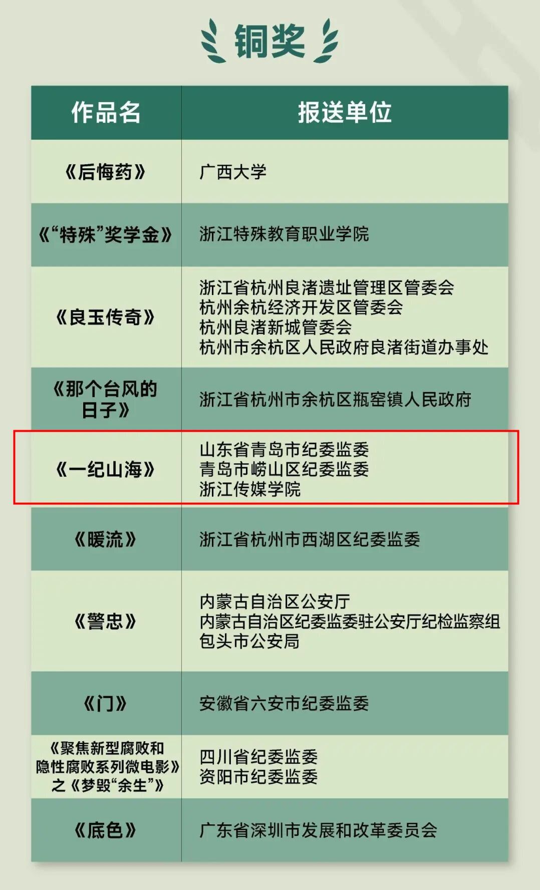 第六屆“玉琮杯”清廉微電影微視頻大賽于2024年9月3日啟動,由中國紀(jì)檢監(jiān)察雜志社、浙江省紀(jì)委監(jiān)委、浙江省教育廳、浙江省文聯(lián)、中央廣播電視總臺浙江總站、浙江日報報業(yè)集團(tuán)、杭州市紀(jì)委監(jiān)委、杭州市余杭區(qū)委主辦,余杭區(qū)紀(jì)委監(jiān)委、浙江法治報社、浙江省電影家協(xié)會、浙江傳媒學(xué)院承辦。比賽自啟動以來,共有2493部作品參賽,經(jīng)層層評審,共有118部作品獲獎。其中,我校榮獲第六屆“玉琮杯”清廉微電影微視頻大賽組織獎(全國高校唯一);學(xué)校和山東省青島市紀(jì)委監(jiān)委、青島市嶗山區(qū)紀(jì)委監(jiān)委共同制作的微電影《一紀(jì)山海》獲得第六屆“玉琮杯”清廉微電影微視頻大賽微電影類銅獎,并被央視頻推薦為深入貫徹中央八項規(guī)定精神學(xué)習(xí)教育的全國9部優(yōu)秀微電影之一。此外,6部作品榮獲“玉琮杯”全國高校賽區(qū)獎項。
