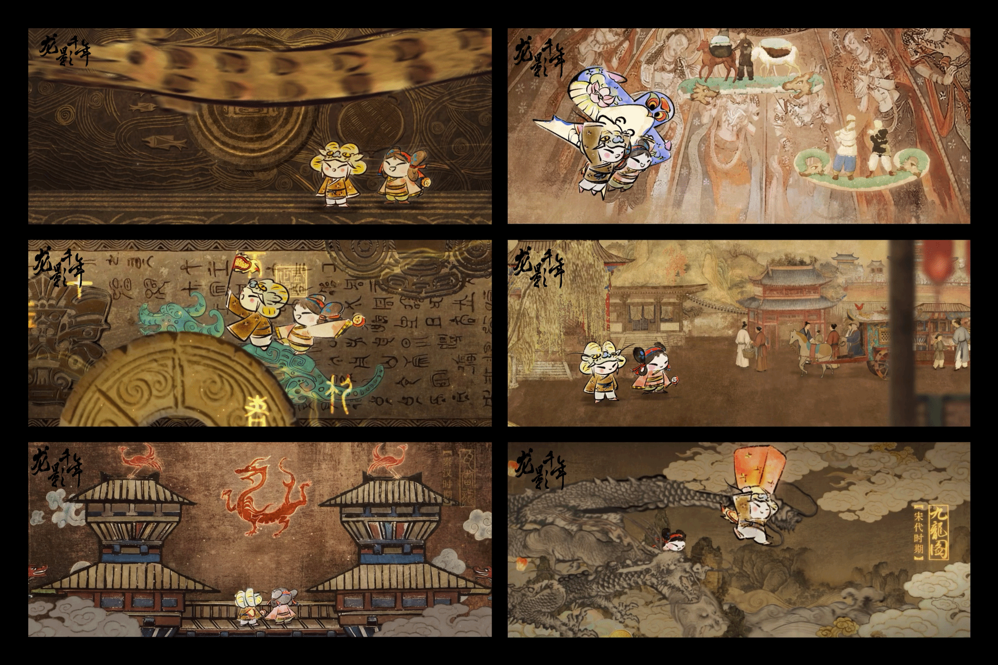 良渚文化方面,在影片巧妙的嵌入了良渚玉琮、良渚玉鳥、獸面紋等具有代表性的良渚元素,為影片增光添彩。新疆文化方面,將龜茲壁畫、西域商旅、絲綢之路等也做了巧妙融合,尤其是龜茲壁畫里的“生肖龍”,流失在海外德國柏林文化博物館,通過藝術(shù)作品讓文物“回國”。大系和典藏館元素方面,將“盛世修典”融入影片文字章節(jié),以漢文字的角度傳播盛世文化,影片最后以《大音希聲 ?龍影千年“中國歷代繪畫大系”項目實施二十周年》為題,再次強調(diào)大系成果,畫龍點睛。