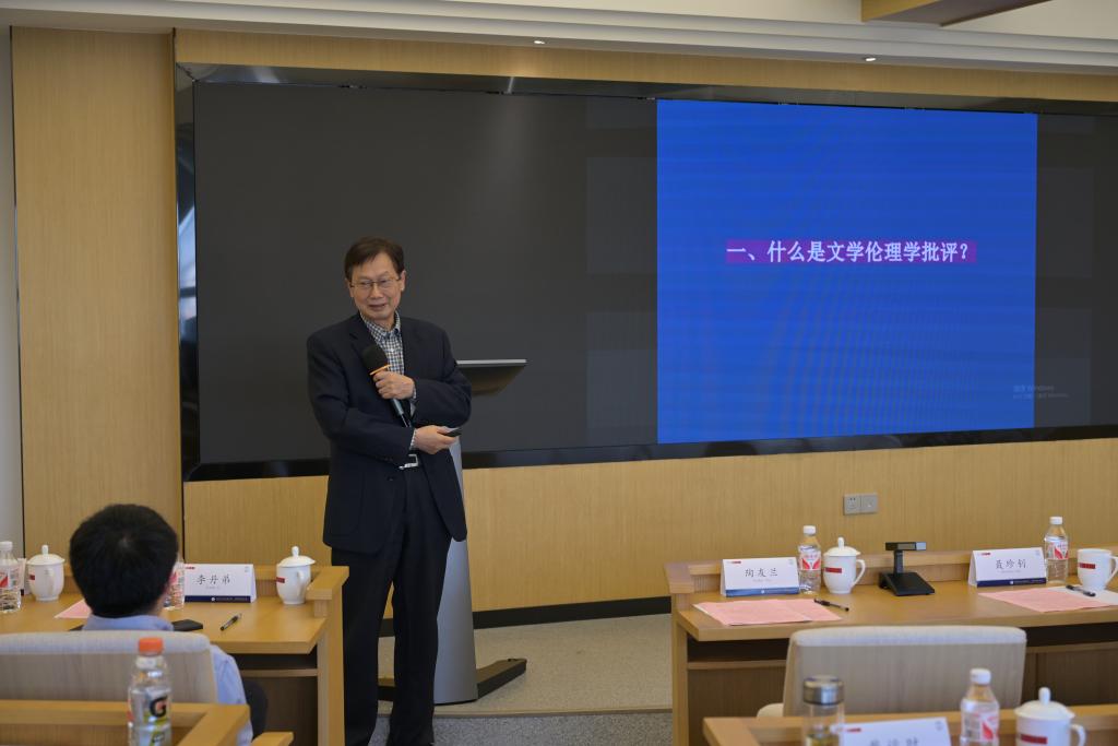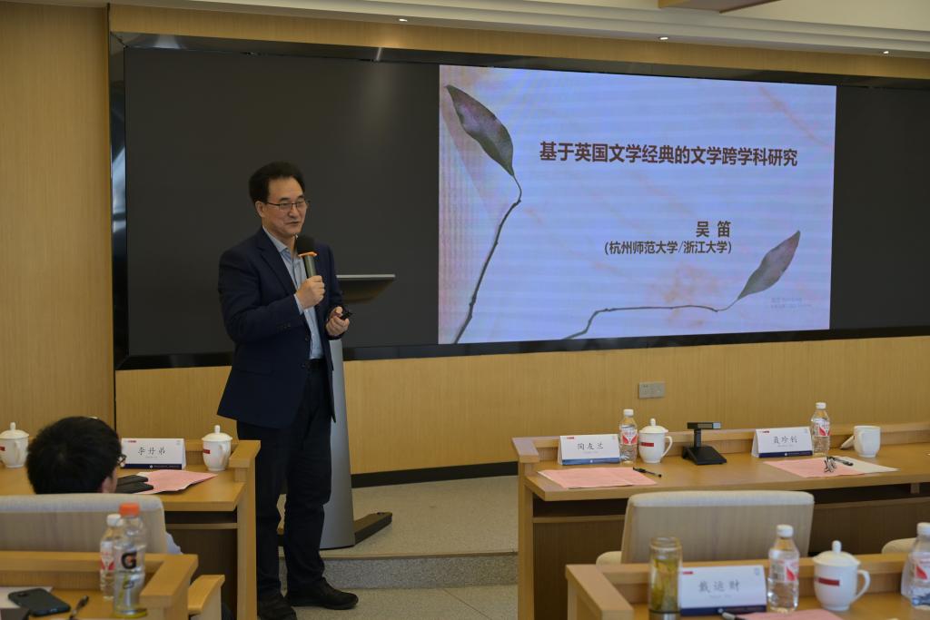 杭州師范大學錢塘學者講席教授,浙江大學文學院二級教授、博導,(中國)中外語言文化比較學會會長吳笛作了題為《基于英國文學經(jīng)典的文學跨學科研究》的發(fā)言,介紹了英國文學跨學科批評,如倫理批評、經(jīng)濟學批評、生態(tài)批評、法律批評等跨學科的研究方向。