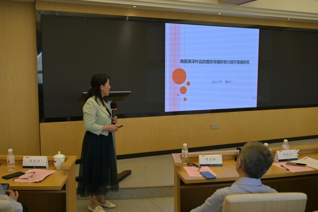 復旦大學翻譯系主任,全國文化名家暨“四個一批”領(lǐng)軍人才,教授、博導陶友蘭作了題為《典籍英譯作品的國際傳播影響力提升策略研究》的發(fā)言,結(jié)合當下國情闡釋了國際傳播戰(zhàn)略背景下的對外翻譯現(xiàn)狀和要點;根據(jù)典籍作品的特點及翻譯難點介紹“譯-寫-傳”(TWC)策略;結(jié)合中譯外實踐反思對國際傳播人才培養(yǎng)進行了深度探討。