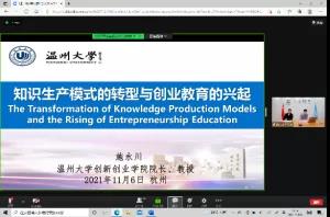 溫州大學創新創業學院院長施永川教授作《知識生產模式的轉型與創業教育的興起》的演講。他表示,創新是對發展技術知識的導入和商業化應用的選擇過程,其本質是支持重構的過程。高效的知識生態模式可分為若干種模式,其一注重解決知識生產的學術性問題,為單學科單領域知識體系;其二則更加關注社會知識應用需求,具有高度流動性、跨學科、靈活等特點。他強調,面臨社會的再造和重構,我們應思考社會道理與現實利益的倫理關系,注重長效發展,不斷改革創新。