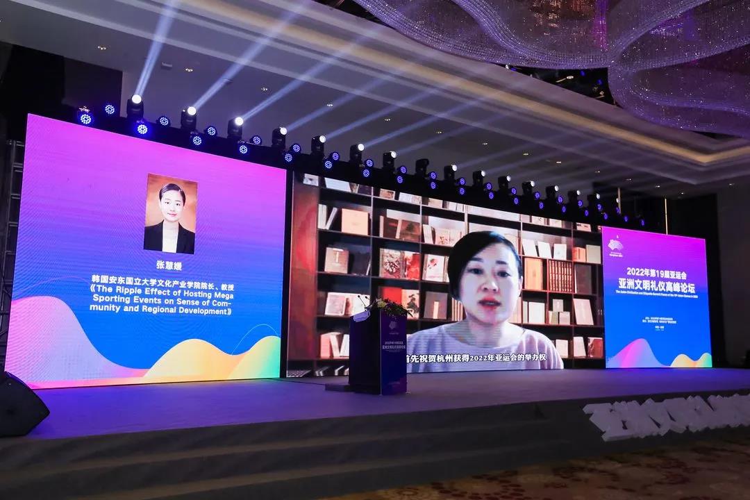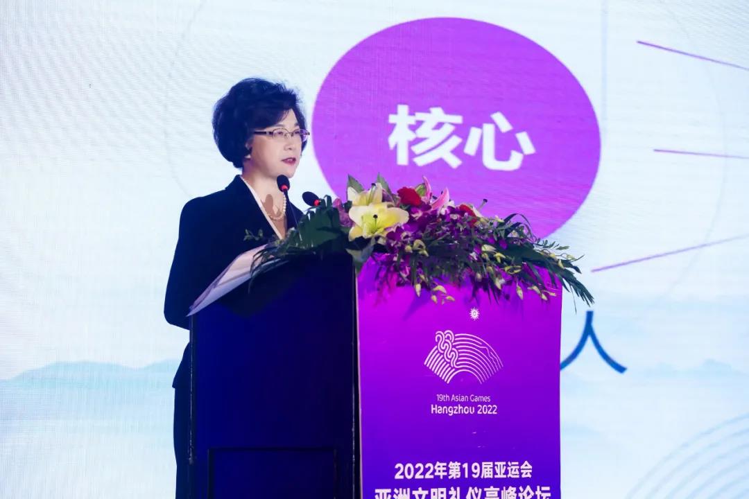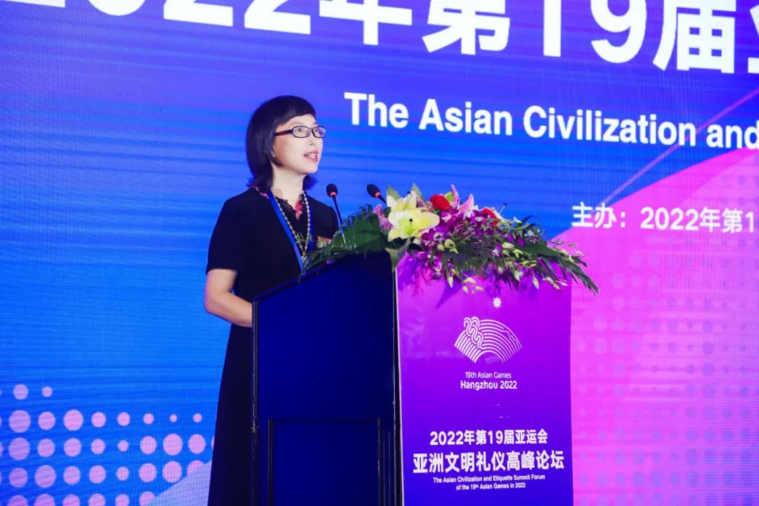 楊立平受邀作《文明禮儀與美好城市》主旨演講,她表示,國際體育賽會,既是競技戰場,也是文明賽場;既盛開健美之花,也盛開友誼之花、文明之花、和平之花。亞運會歷經風雨榮光走到今天,本身就是亞洲人民的文明財富、禮儀碩果。政界、學界、業界大咖齊聚一堂,以亞運之名,共商文明禮儀之道,必將為杭州亞運譜寫精彩篇章、留存人文內涵。隨后,她從四個方面作具體闡述。