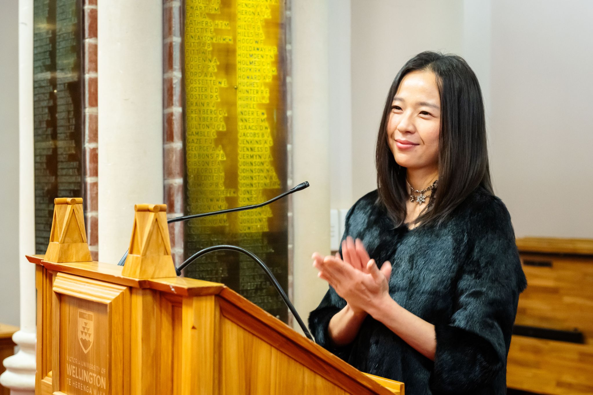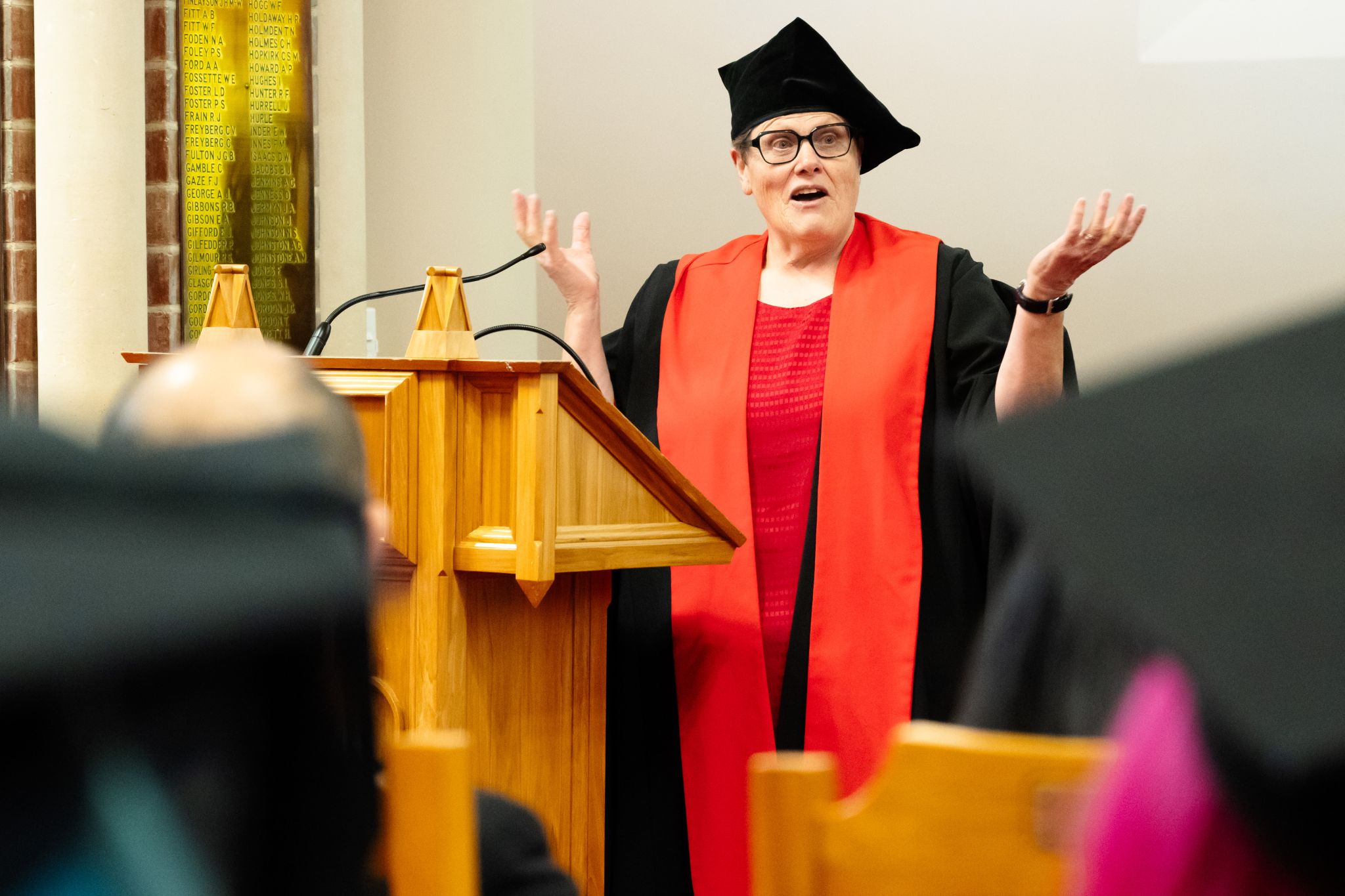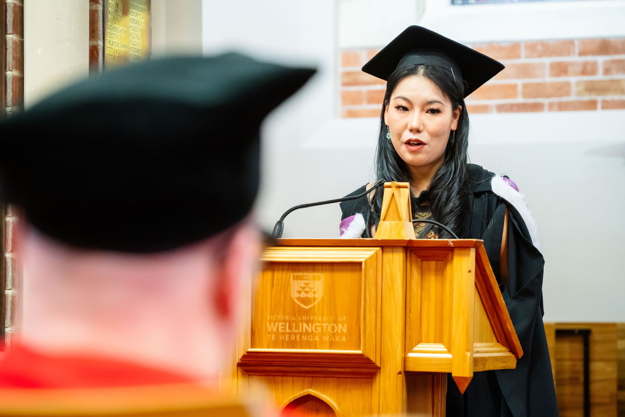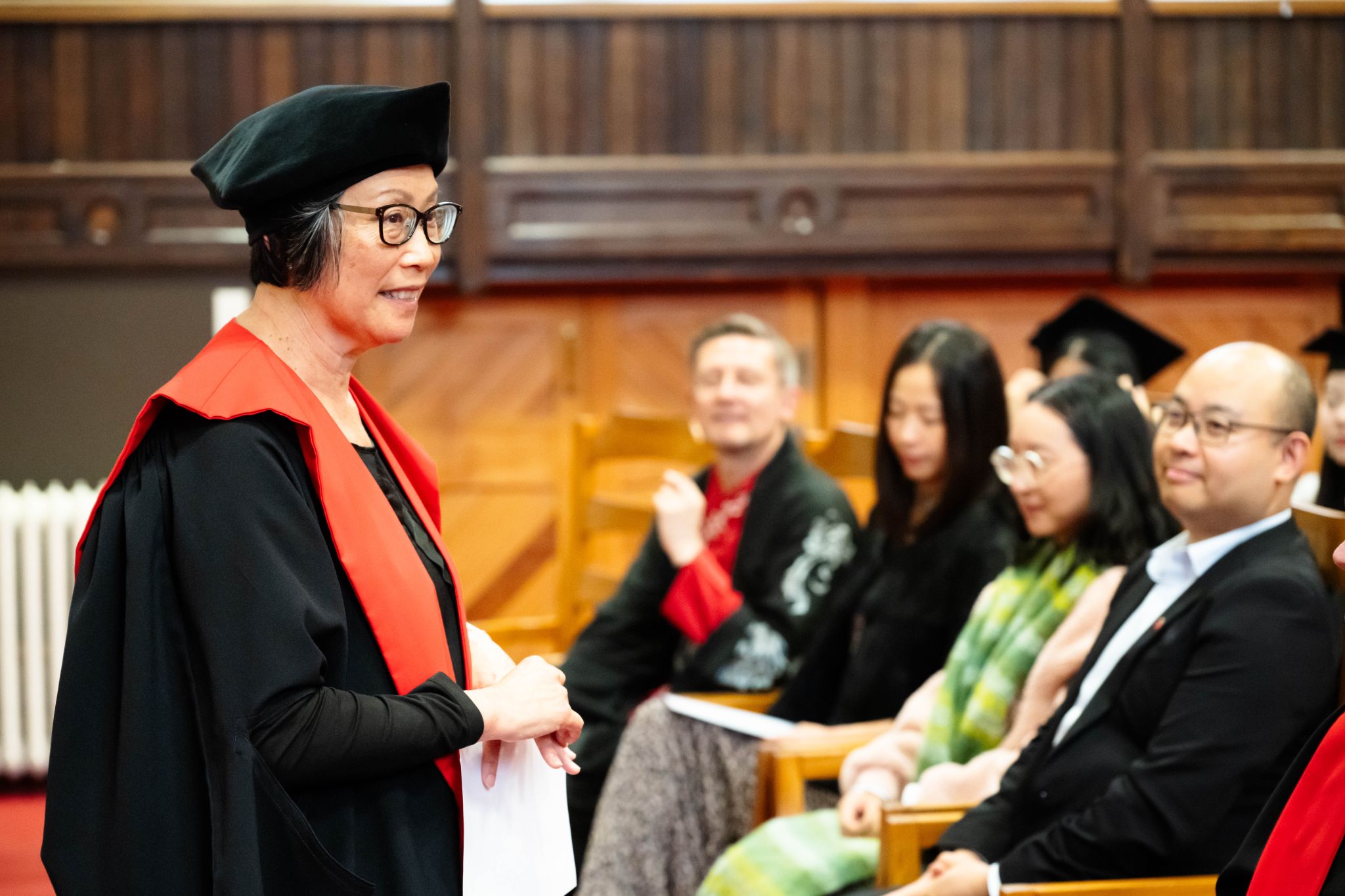 維大人文與社會科學學院院長Averil Coxhead教授在典禮上發表致辭并為畢業生頒發學位證書。她首先感謝來自浙江傳媒學院的畢業生們在本科階段的第四年選擇美麗的“長白云之鄉”新西蘭,并到維大求學,為學校注入了新的活力。她特別提到:"同學們不僅帶來了中國文化的獨特視角,更以優異的學術表現展現了中新教育合作的豐碩成果。"Averil院長高度稱贊浙傳同學們堅韌、肯鉆研、刻苦努力的學習態度,對學業成果表示肯定,并祝愿畢業生們在新的人生階段取得更大成就。