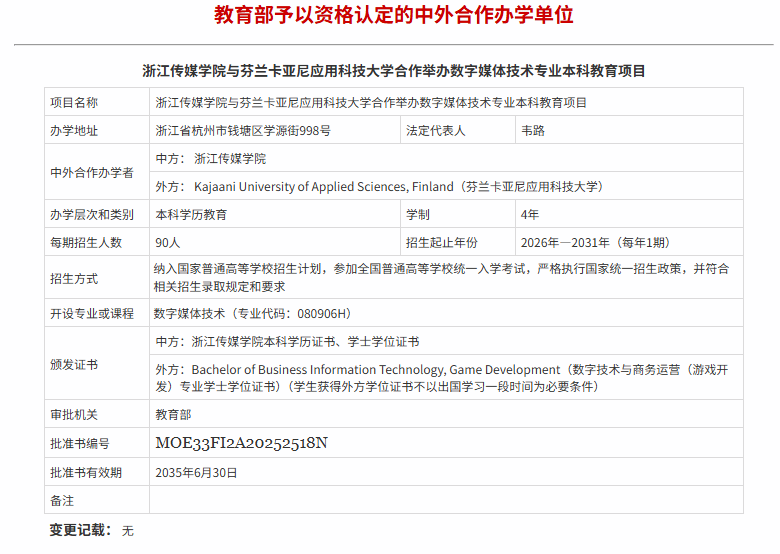 近日,教育部正式印發(fā)《關(guān)于批準2025年上半年中外合作辦學(xué)及內(nèi)地與港澳地區(qū)合作辦學(xué)項目的函》(教外函〔2025〕73號),我校與芬蘭卡亞尼應(yīng)用科技大學(xué)合作舉辦的數(shù)字媒體技術(shù)專業(yè)本科教育項目獲批立項。