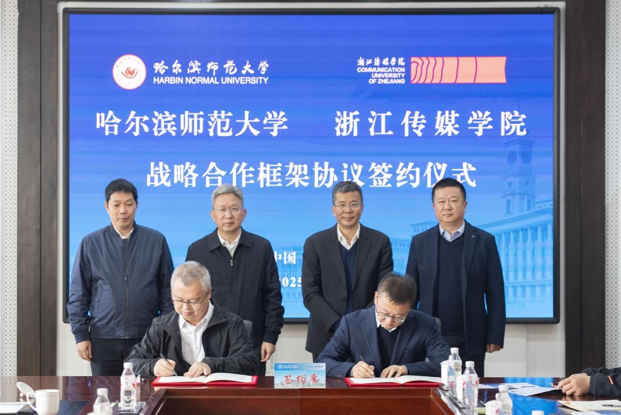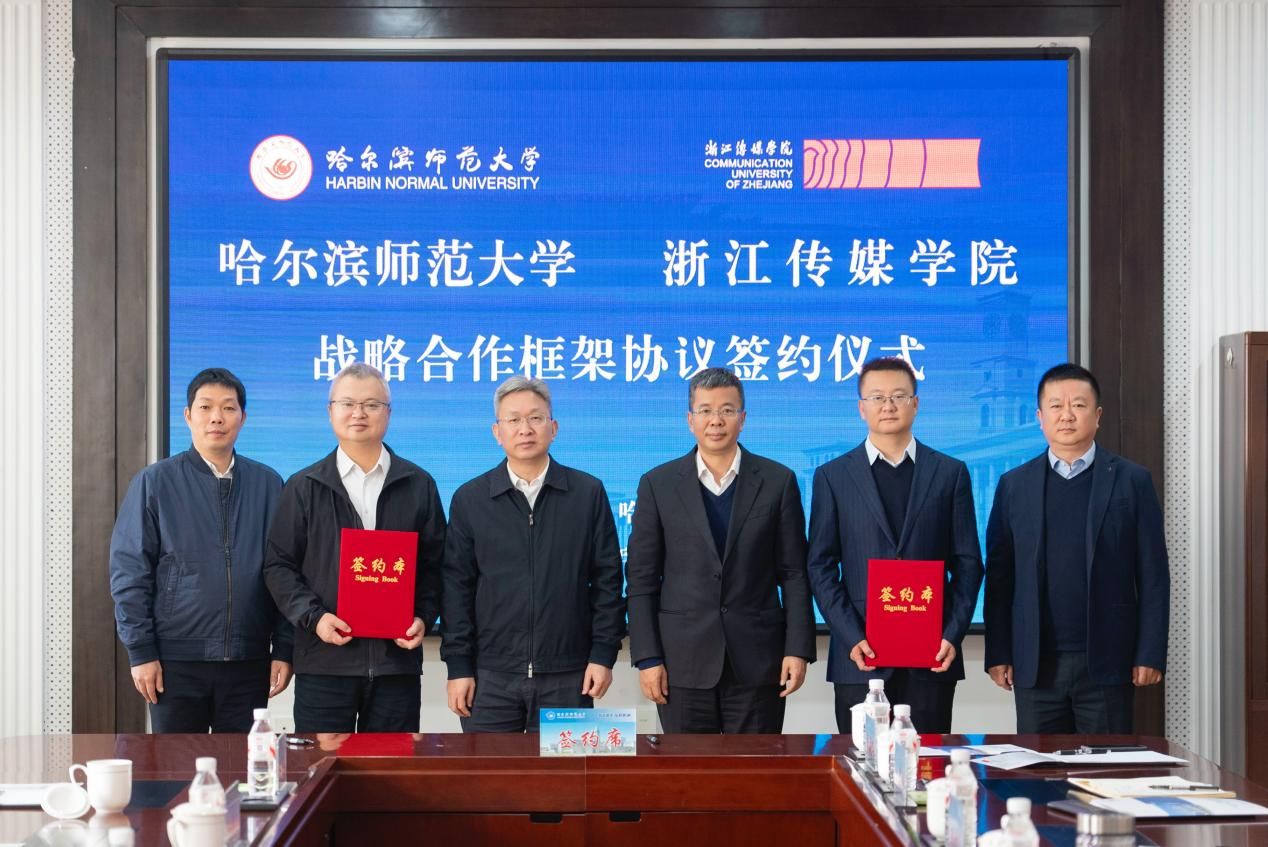 調研座談后,姚爭、李林分別代表兩校簽署《浙江傳媒學院 哈爾濱師范大學戰略合作框架協議》,韋國潭、孫立軍共同見證簽約時刻。