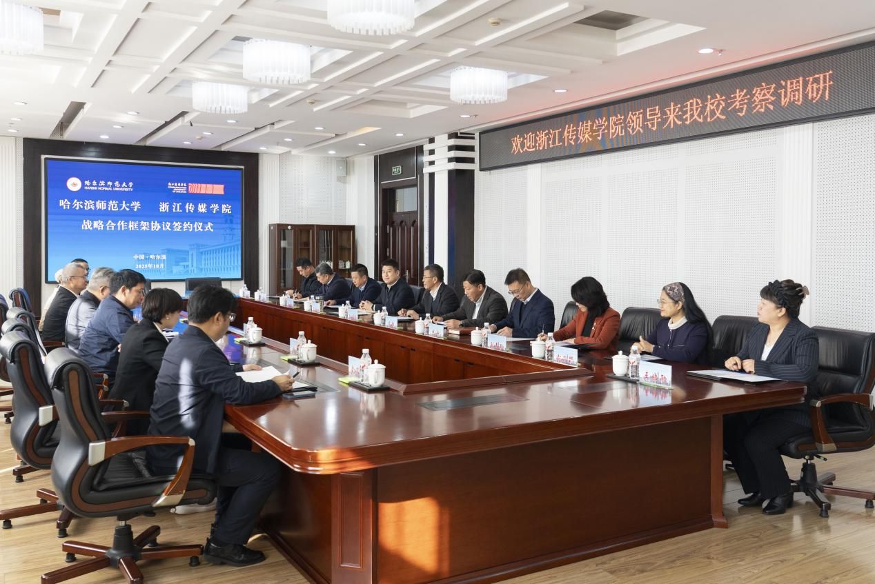 10月16日上午,我校黨委書記韋國潭、副校長姚爭一行赴哈爾濱師范大學調研考察,并簽署戰略合作框架協議。哈爾濱師范大學黨委書記孫立軍,校長、黨委副書記蔣鯤,黨委常委、副校長陳永斌(浙江傳媒學院黨委副書記)、李林出席簽約儀式。