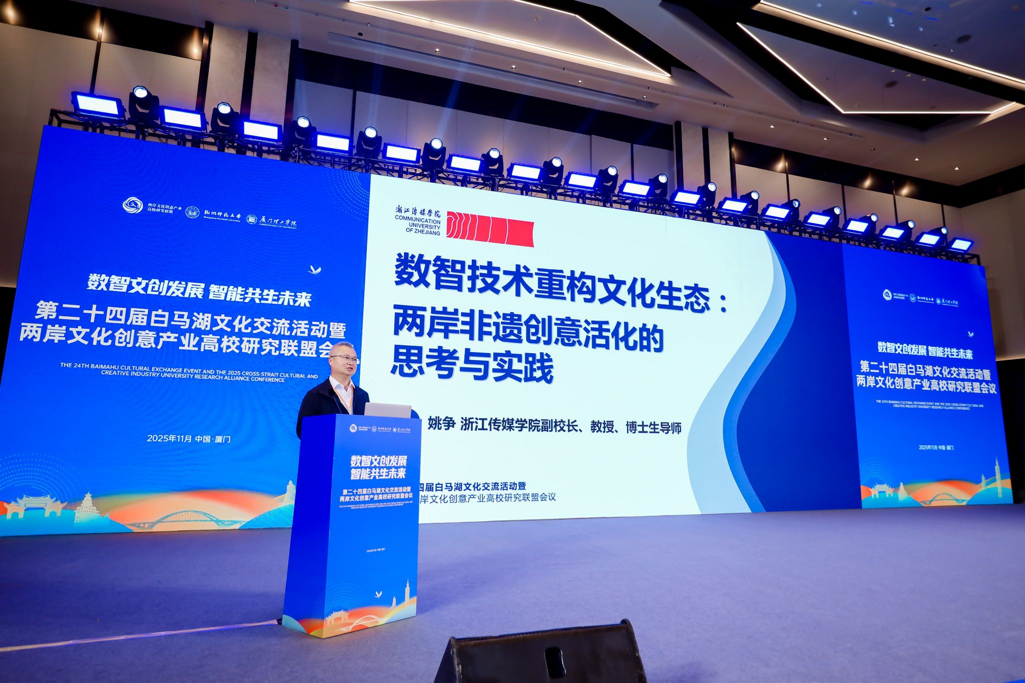 11月1日,以“數(shù)智文創(chuàng)發(fā)展·智能共生未來(lái)”為主題的第二十四屆白馬湖文化交流活動(dòng)暨2025兩岸文化創(chuàng)意產(chǎn)業(yè)高校研究聯(lián)盟會(huì)議在廈門(mén)舉辦,副校長(zhǎng)姚爭(zhēng)出席年會(huì)并作主旨演講。學(xué)校港澳臺(tái)事務(wù)辦公室、傳媒實(shí)踐教學(xué)與藝術(shù)創(chuàng)作中心負(fù)責(zé)人陪同參加活動(dòng)。