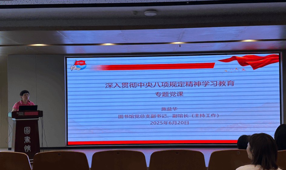 6月20日,圖書館黨總支舉辦深入貫徹中央八項規定精神學習教育專題黨課,黨總支副書記、副館長(主持工作)施益華作了題為《鍥而不舍落實中央八項規定精神,以優良作風保障工作高質量發展》的專題授課,黨總支全體黨員參加會議。